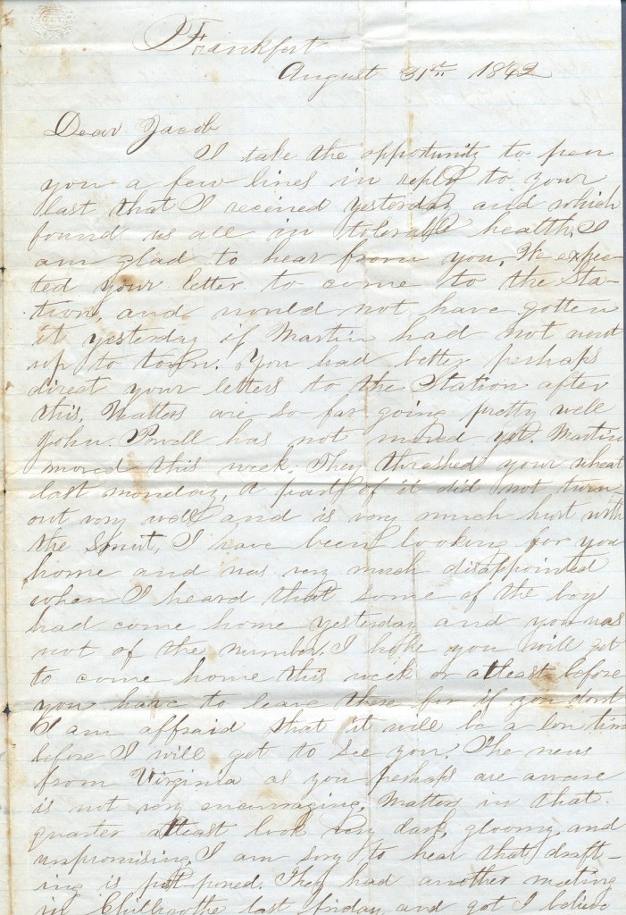 The news from Virginia as you perhaps are aware is not very encouraging. Matters in that quarter at least look very dark, gloomy and unpromising. I am sorry to hear that drafting is postponed. They had another meeting in Chillicothe last Friday and got I believe thirty or forty volunteers among them Veach Rittenhouse, Jo Anderson, and Will Henness (Zach’s Will).