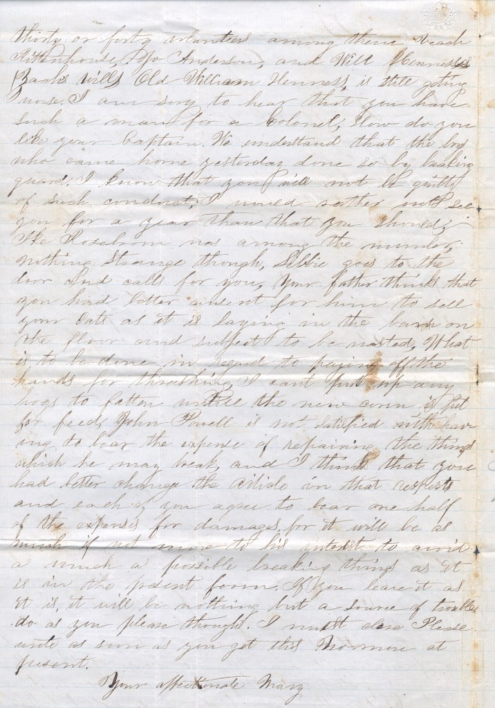 Your father thinks that you had better assent for him to sell your oats as it is laying in the barn on the floor and subject to be wasted. What is to be done in regard to paying off the hands for thrashing. I can’t put up any hogs to fatten until the new corn is fit for feed. John Powell is not satisfied with having to bear the expense of repairing the things which he may break, and I think that you had better change the article in that respect and each of you agree to bear one half of the expenses for damages for it will be as much if not more to his interest to avoid as much as possible breaking things as it is in the present form. If you leave it as it is, it will be nothing but a source of trouble. Do as you please though. I must close. Please write as soon as you get this. No more at present.