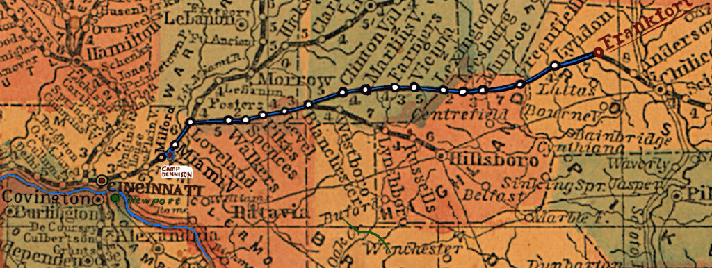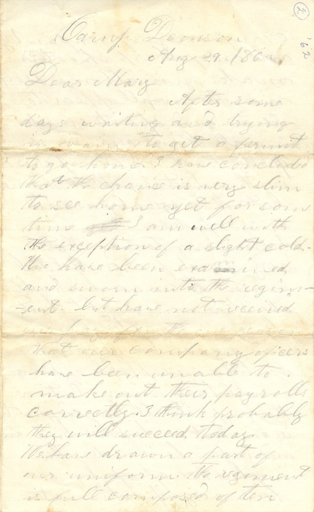 Jacob left home for war at the age of 29 in August of 1862 and reported to Camp Dennison (on the northeast side of Cincinnati, Ohio) from his family home in Frankfort, Ohio (near Chillicothe, Ohio). He joined in response to Confederate General Kirby Smith’s threatened attack on Cincinnati. The following is the first letter we have from Jacob written to his wife, Mary. He’s at Camp Dennison getting acquainted with life in the Army. Problems with thrusting citizens into military leadership with little to no experience are apparent in this first letter. Jacob joined as a private – he didn’t have enough social standing to merit votes for a leadership position at the war’s outset – but his strength of character and bravery would show soon enough, resulting in a rise through the enlisted ranks that would leave him, at wars end, as the regimental Color Sergeant (more on that later).