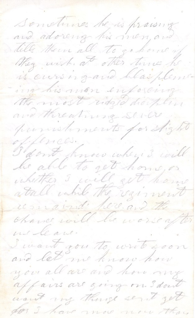I want you to write soon and let me know how you all are and how my affairs are going on. I don’t want my things sent yet for I have more now than I can take care of. Be well assured that I am very well satisfied if I only knew that everything was going right at home for I am satisfied I can live pretty well contented under the circumstances if I only was convinced all the while that you was contented and doing well.