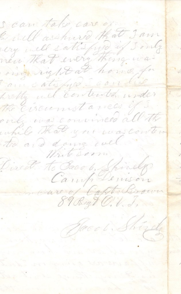 Write soon. Direct to Jacob Shively, Camp Denison in care of Capt Brown 89 Regt O.V.I.