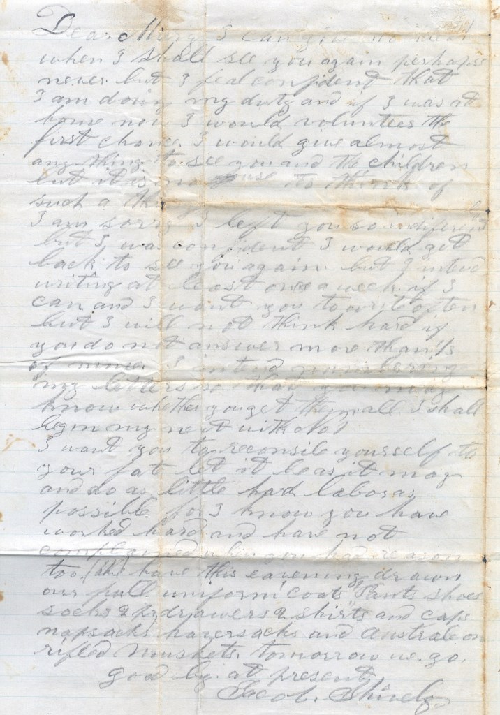 I want you to reconcile yourself to your fate let it be as it may and do as little hard labor as possible, for I know you have worked hard and have not complained when you had reason too. We have this evening drawn our full uniform – coat, pants, shoes, socks, 2 pairs of drawers, 2 shirts, and caps, knapsacks, haversacks, and Austrian rifled muskets. Tomorrow we go.
