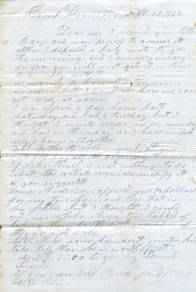 Jacob’s Regiment, the 89th Ohio Volunteer Infantry, was officially mustered into service on 29 August, 1862 at Camp Dennison. They were surprised with marching orders on 1 Sept. Jacob had hoped to get home before marching off to war, but as you’ll read below, he missed his chance and had to scramble to make what arrangements he could before his departure. I think the “Sir” to whom he addressed the first side of this letter was Martin – his friend and brother-in-law. Mary and Martin were twins – abandoned by their father to neighbors who were some sort of relative after the death of their mother. I think Jacob’s friendship with Martin proceeded his relationship with Mary – but I can’t prove it. He remains very close to Martin throughout the war (as you’ll see if you stay with the story). Here’s the letter: